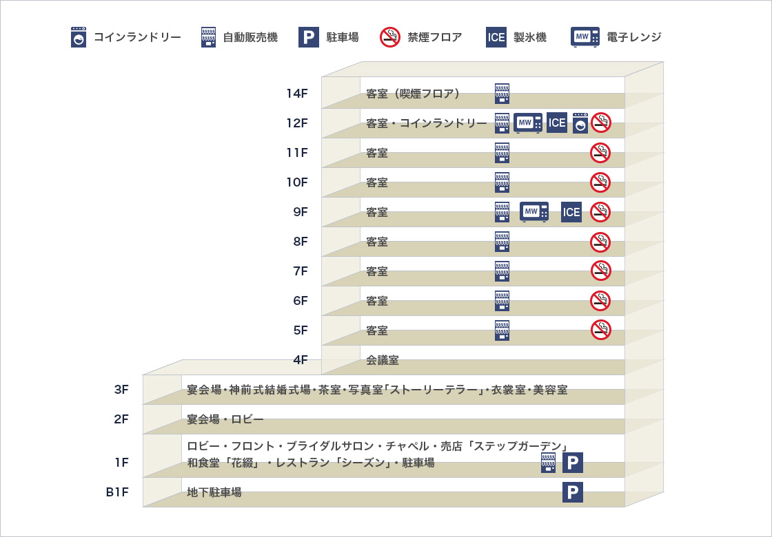 | 台数 | 地下40台(高さ制限2.2m)、地上6台・大型バス駐車可~5台(車長、車幅により異なります)の駐車場をご用意しております。(先着順) |