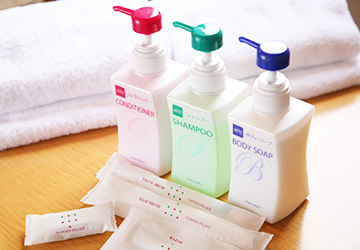 - テレビ、有料ビデオ、衛星放送(無料)、電話、ティーサーバー、お茶セット、コーヒーセット、冷蔵庫、ドライヤー、洗浄機付トイレ、石鹸(液体)、シャンプー、リンス、洗顔ソープ、ハミガキセット、カミソリ、シャワーキャップ、ブラシ、タオル、バスタオル、ボディタオル、浴衣、スリッパ、有線LAN